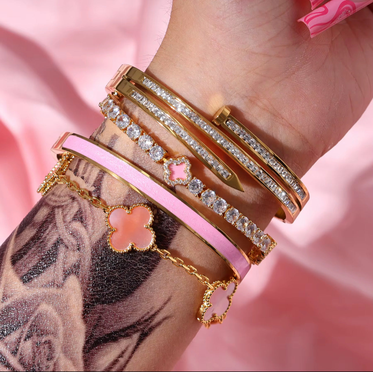 This dazzling 4-piece stainless steel bracelet bangle set gleams with sparkling clover designs, each bursting with full diamond-style brilliance. Perfect for adding a playful sparkle to any outfit!